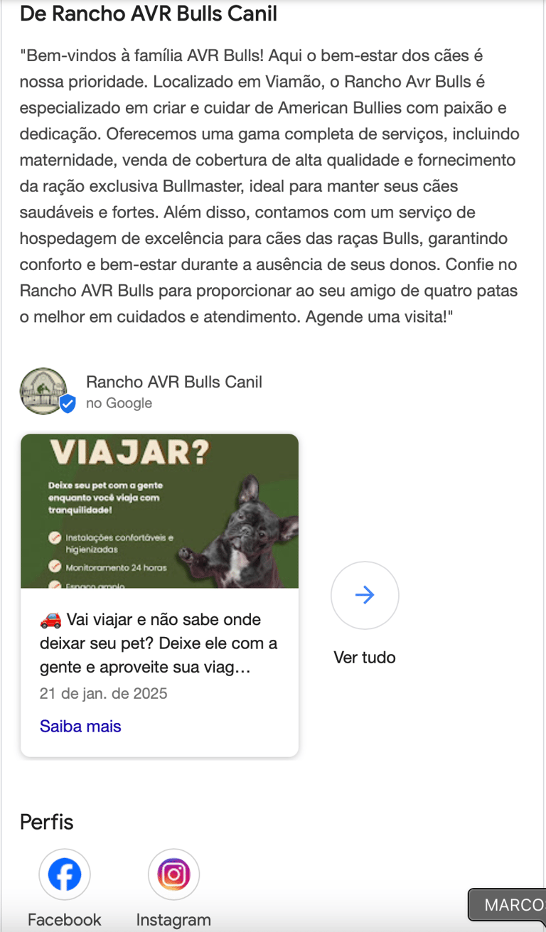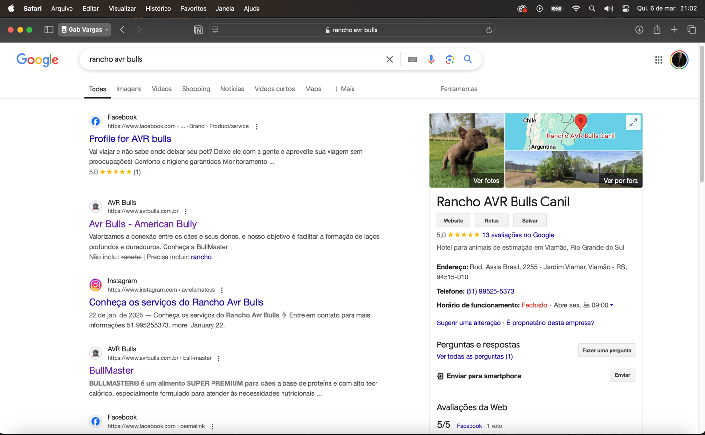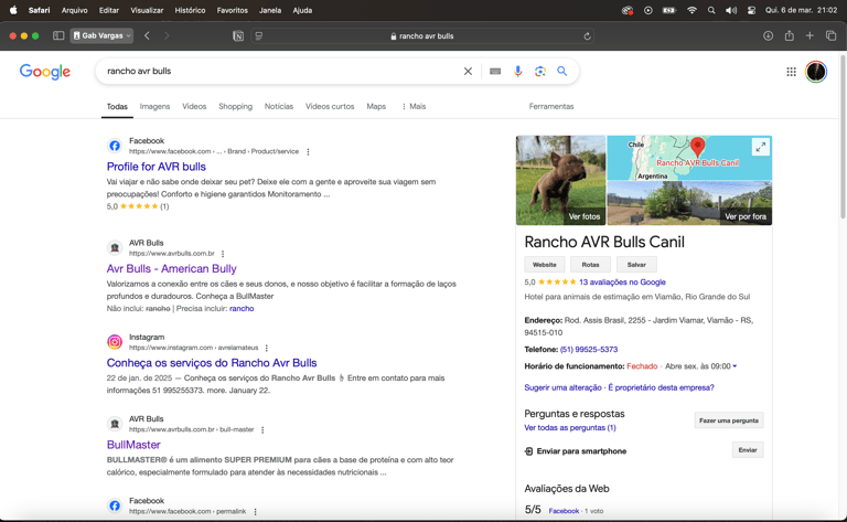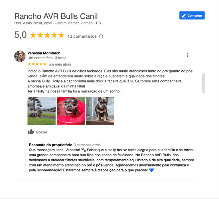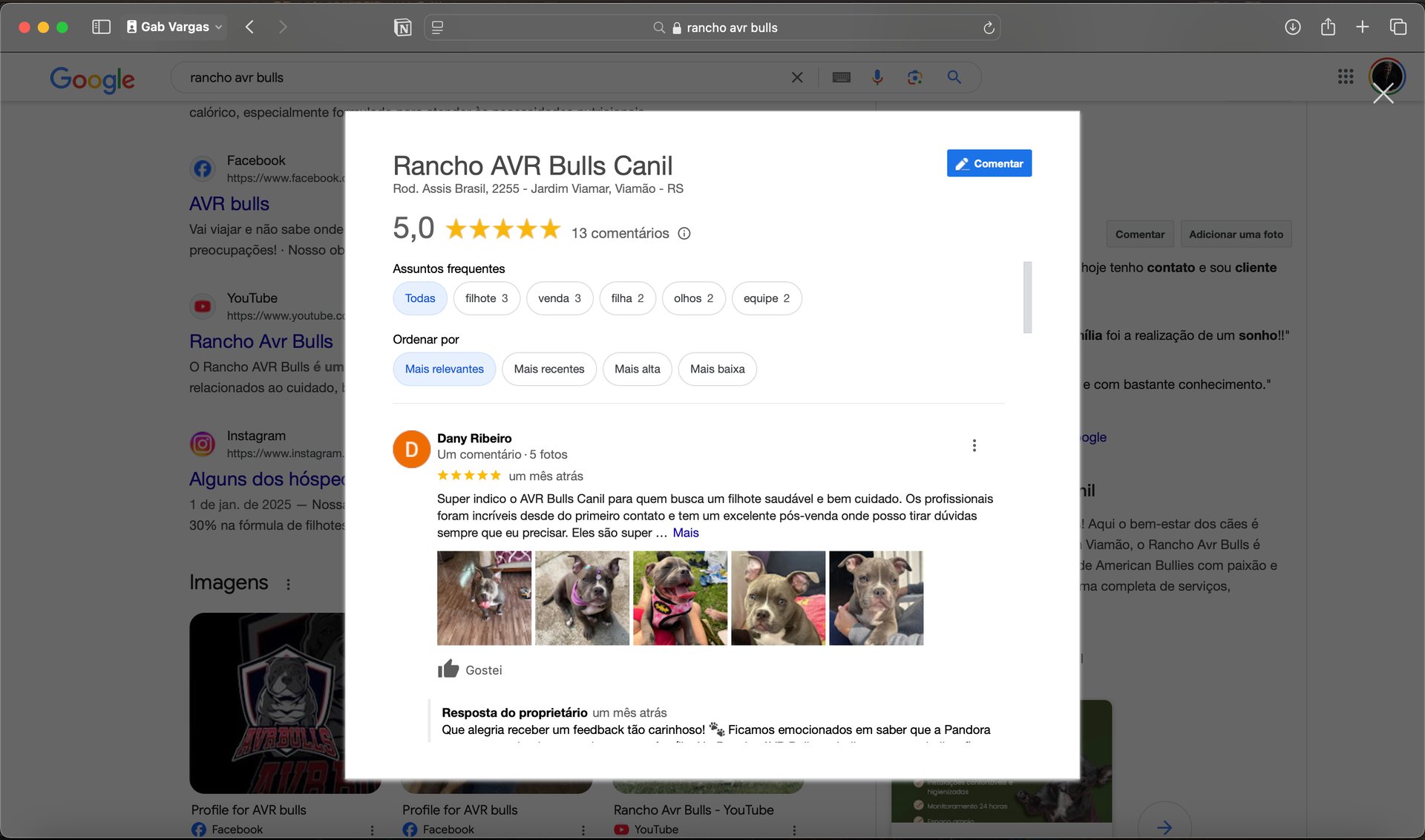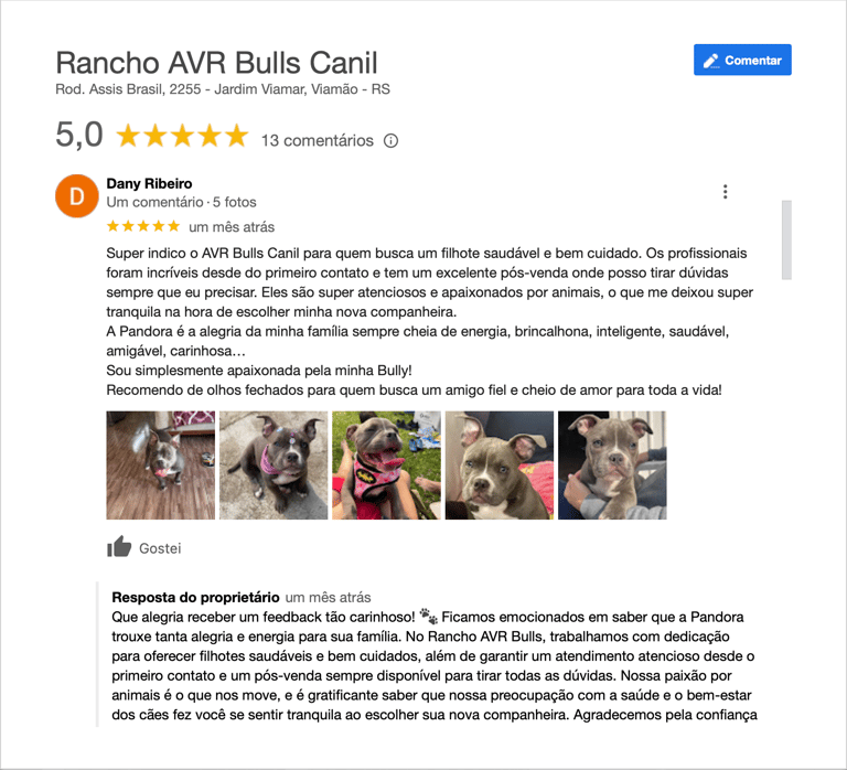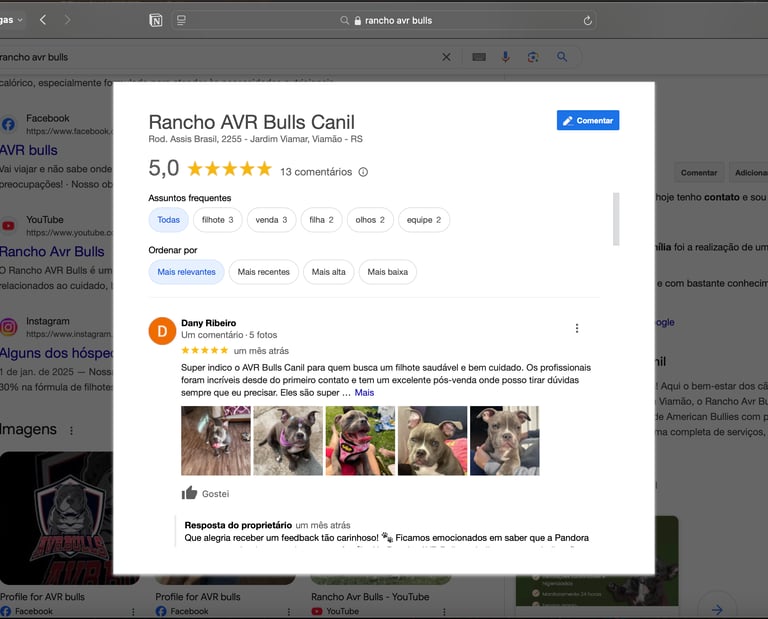 O Rancho AVR Bulls conquistou maior visibilidade nas buscas do Google, atraindo clientes qualificados tanto para a criação de American Bullies quanto para o hotel para cães, consolidando sua presença digital e ampliando as oportunidades de negócio.