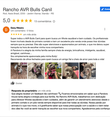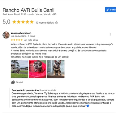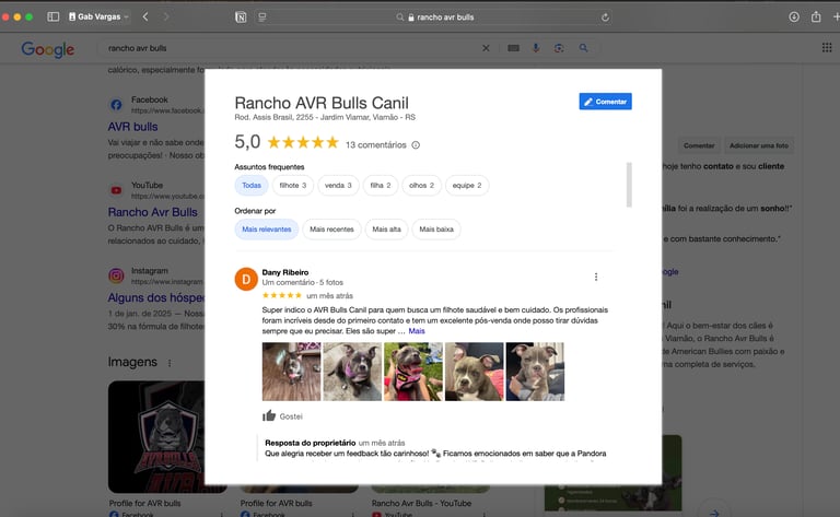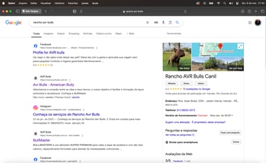 O Rancho AVR Bulls conquistou maior visibilidade nas buscas do Google, atraindo clientes qualificados tanto para a criação de American Bullies quanto para o hotel para cães, consolidando sua presença digital e ampliando as oportunidades de negócio.